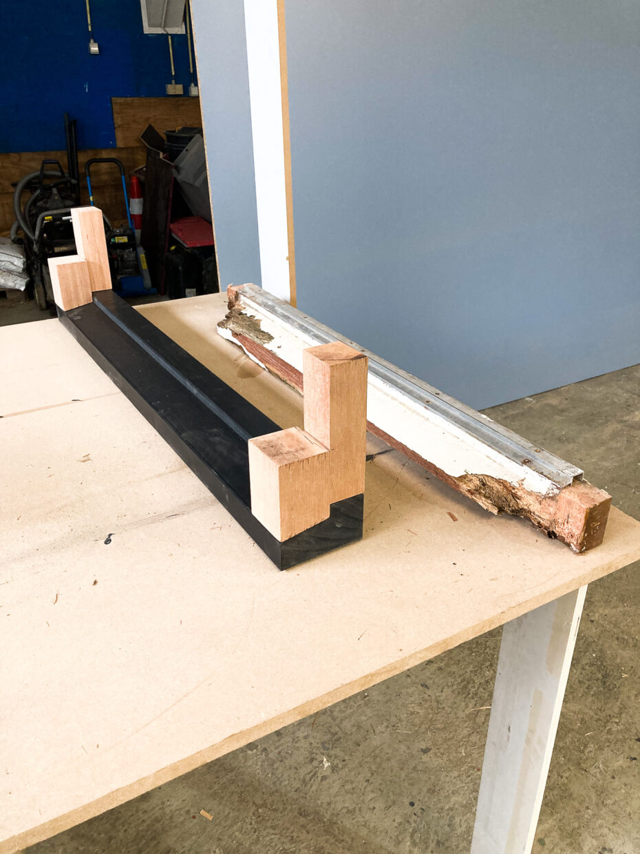 Het vorige kozijn was helemaal rot. Daarom is er een nieuw kozijn gemaakt. Er is gekozen voor hardhout, dat is bestand tegen alle weersomstandigheden.