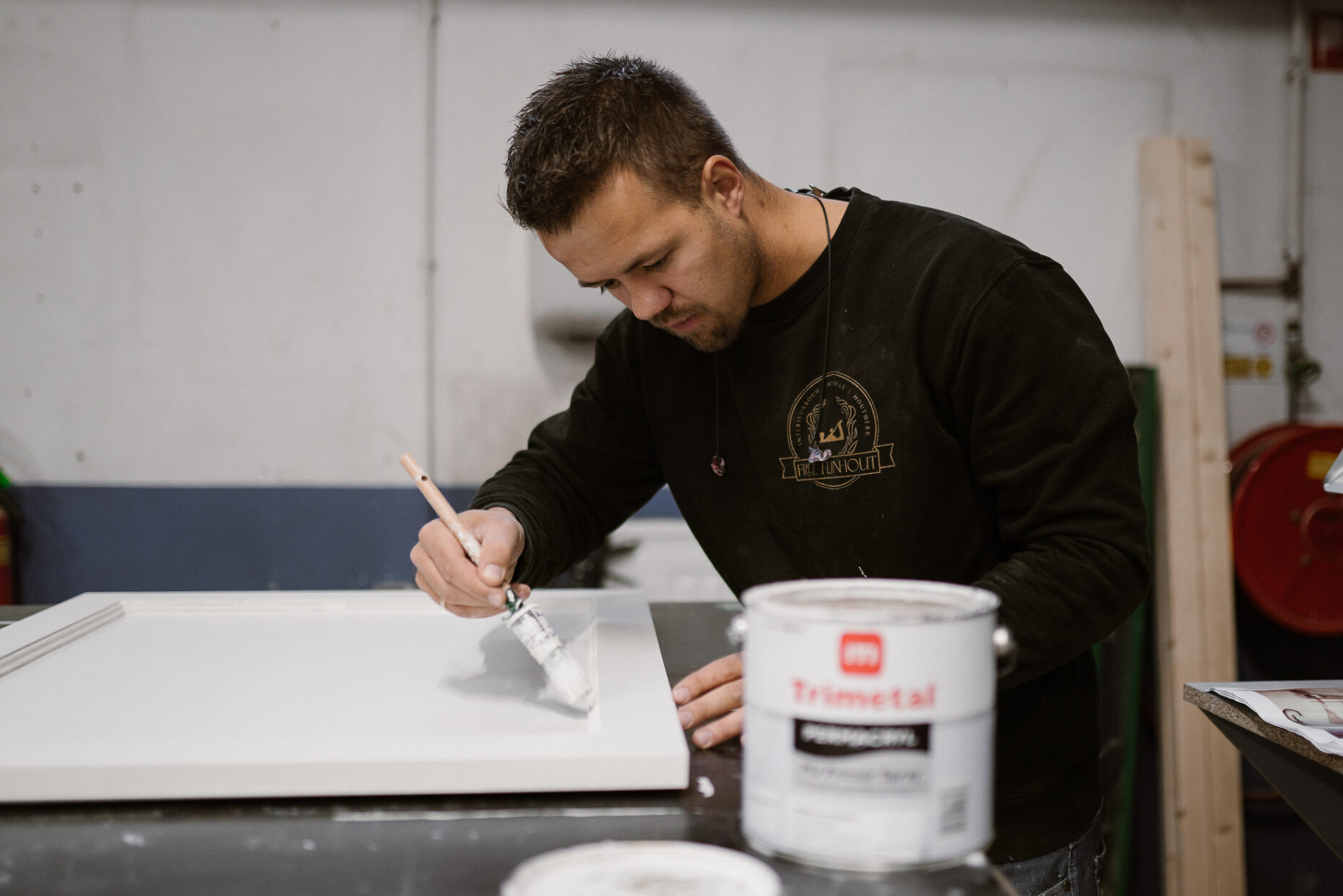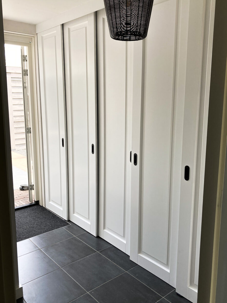 In de gang zijn deze paneeldeuren gemaakt. Handig om jassen en schoenen achter op te bergen. Door het schuifsysteem is het ruimtebesparend en oogt het altijd opgeruimd in de gang. De deuren zijn afgelakt met een kleur naar wens.